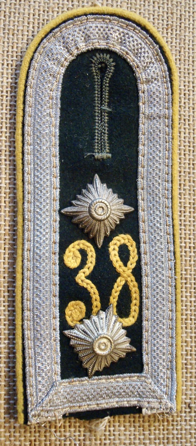 Die stamped, alloy construction national tri-colored shield features a slightly pebbled background shield shape base with a raised lip to the outer edges and an additional three, diagonally angled, fine, raised lips separating the three national colors of black, silver, (white), and red. The reverse of the shield has all three attachment prongs intact.