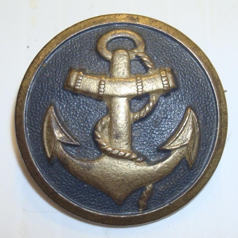 Roughly, 30mm diameter, die struck alloy construction, Female Auxiliaries Service brooch features a gilt washed, embossed, vertical, fouled anchor to the center on a slightly pebbled, navy blue washed field. The central field is encompassed by a smooth, gilt washed, embossed outer edge trim. The reverse of the brooch has a brazed on horizontal pin and catch assembly intact. The brooch has no visible manufacturer’s markings.