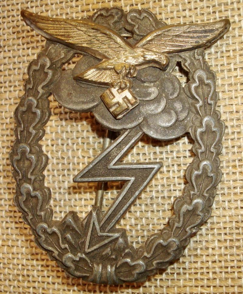 This Luftwaffe Ground Assault Badge by Osang is a one-look original, that shows its age. It’s a desirable two-piece type, made of zinc with a separately applied eagle. The front of the badge shows honest wear, but retains fine detail, especially on the eagle. Catch has been repaired. Consignment item !