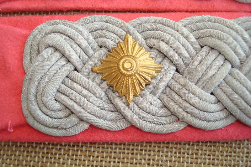 Sew in shoulder boards of interwoven, silver/aluminum Russian braid mounted on Pink wool waffenfarbe bases. Single rank pip to each. Mint unused.