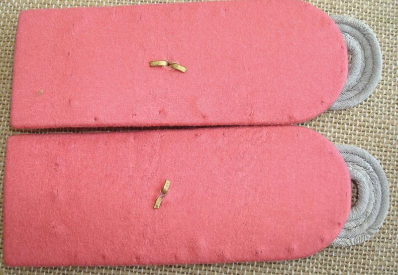 Sew in shoulder boards of interwoven, silver/aluminum Russian braid mounted on Pink wool waffenfarbe bases. Single rank pip to each. Mint unused.