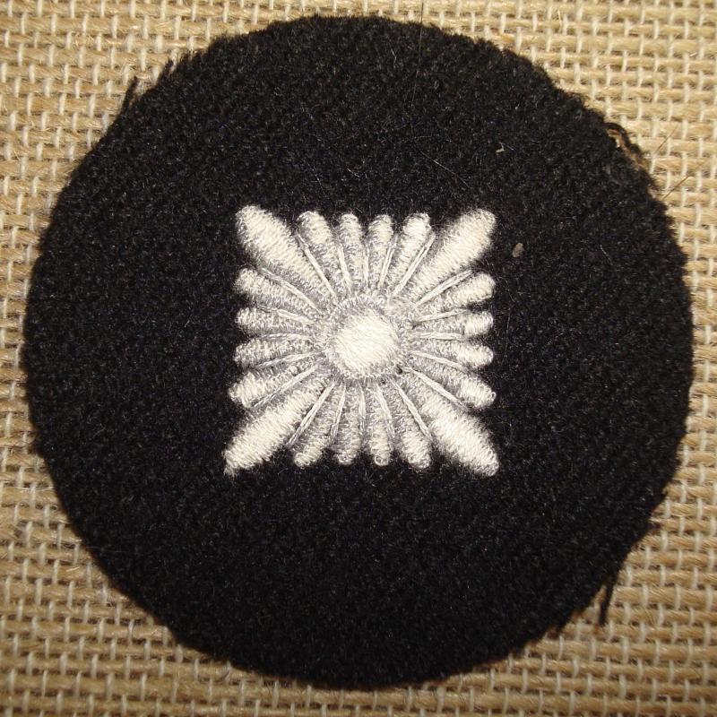 The Panzer Oberschütze rank insignia consists of a roughly, 55mm diameter, black wool base with a central, machine embroidered, rank pip in silver/grey rayon threads.